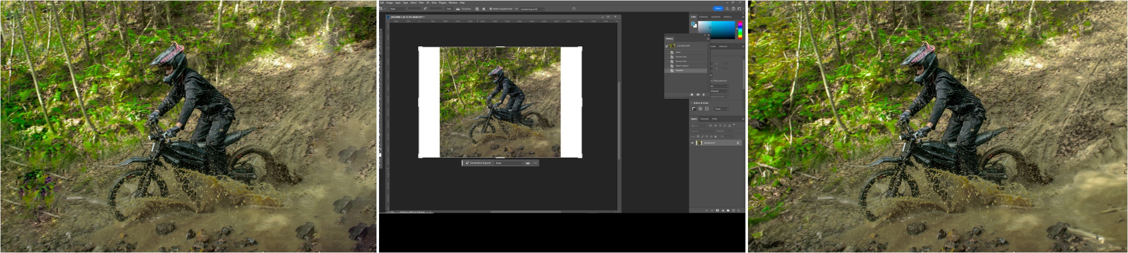 Generative Expand uses the crop tool in the same way to extend the bounds of the image, but using a smart generation of AI can create a much more realistic panorama, less prone to repetition and random pixels. You can see the dramatic difference between the two in the picture of the trials bike going through a mud splash which starts out square to suit social media, but then is extended to more of a landscape to fill a space. With Content Aware, rocks and tree trunks have been obviously cloned and thrown into the mix whereas GenEx does a pretty good job of creating a whole new but complimentary larger landscape.