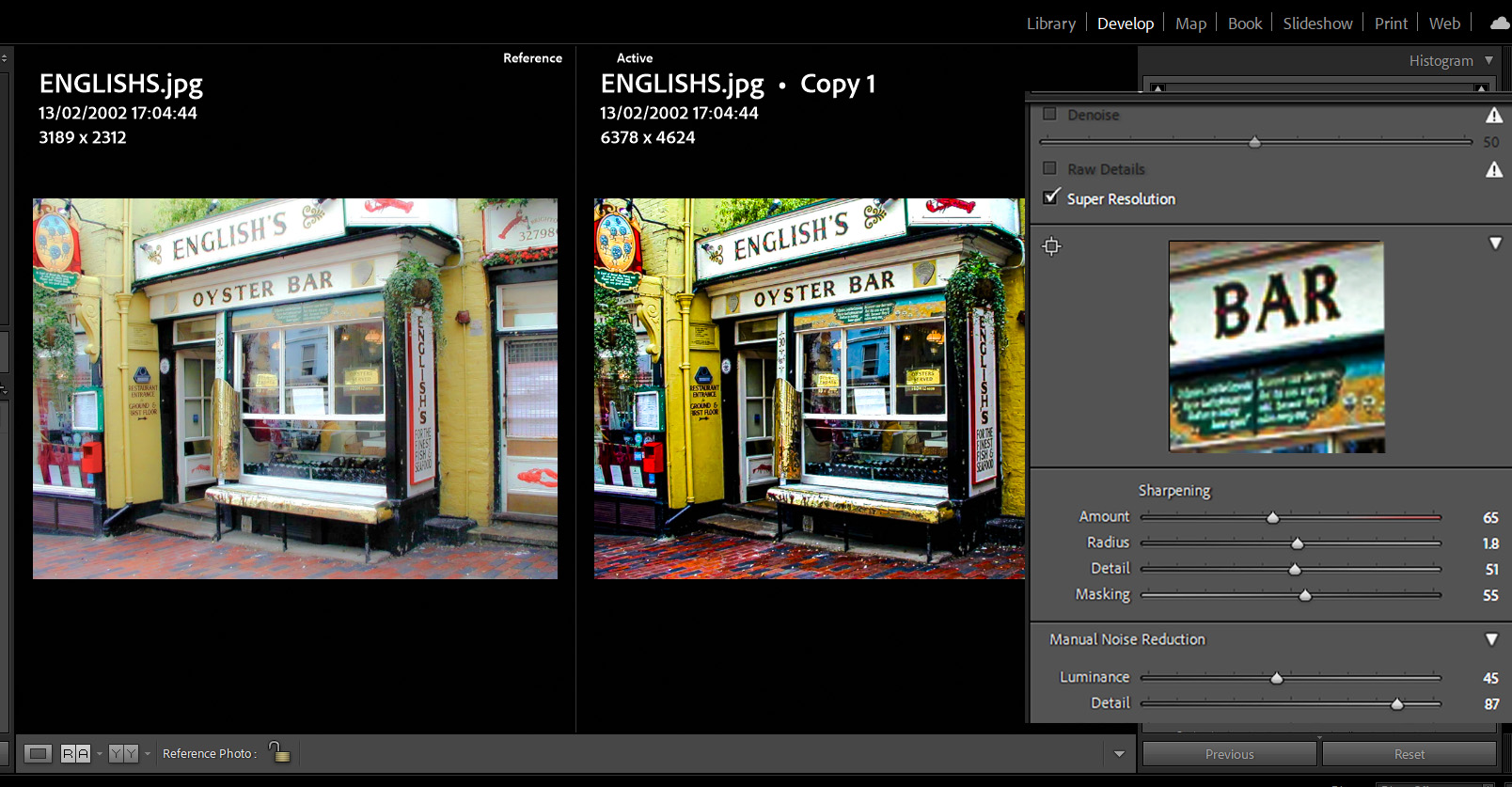 So Super Resolution, unlike an original Enhance process, is tucked away in the Develop module alongside a related AI denoise/RAW detail option which is better for files that are already of a higher resolution. Super res doubles the pixels in a linear pattern so a 1000x1000 pixel becomes 2000x2000. It’s as simple as that and it manages to do that without increasing the electrical interference of noise which has been the Achilles heel of similar options so far.