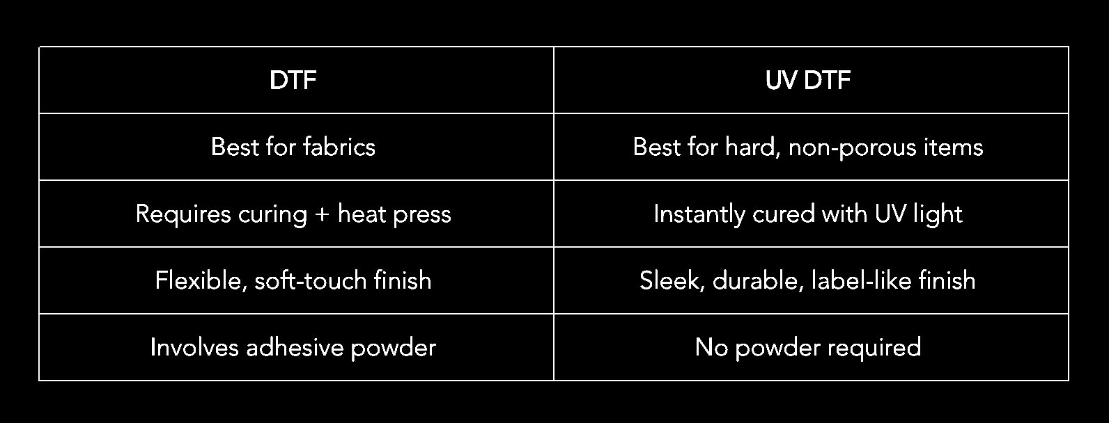 Printing technology moves fast, and one of the most common questions we hear is: what’s the difference between DTF and UV DTF?