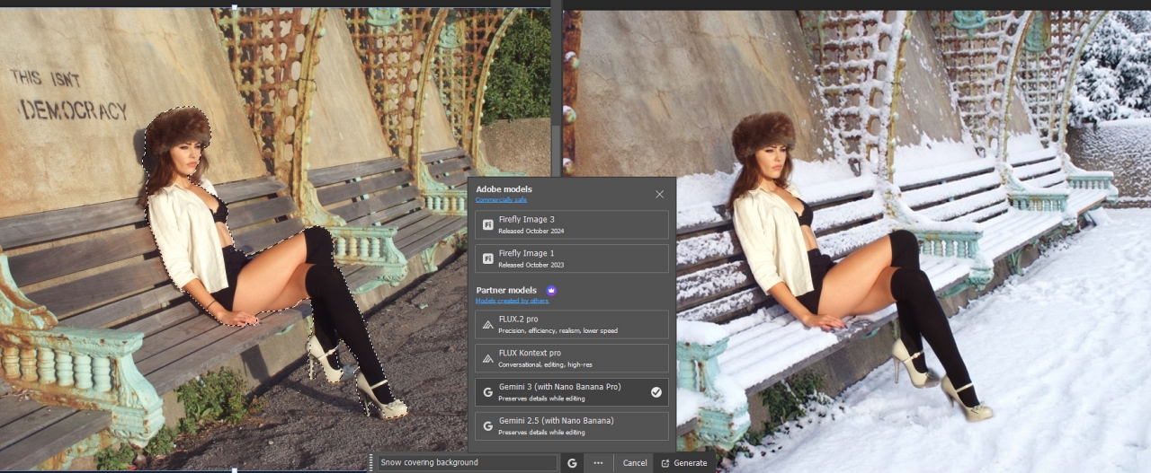 A good number of AI features that have been established in PS over recent years like Content Aware, Selection Masks and the like, do not use any credits. This is because they are essentially sampling existing pixels and reassembling them. When an action starts with the word Generative however, this is where the penalty clause may kick in because you are asking AI to create something entirely new, even if it’s actually based on something that already exists. Confused? Well there’s more because Adobe has recently added some partner programmes from already established AI platforms.